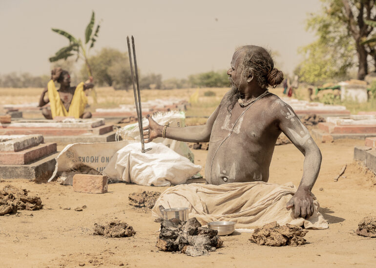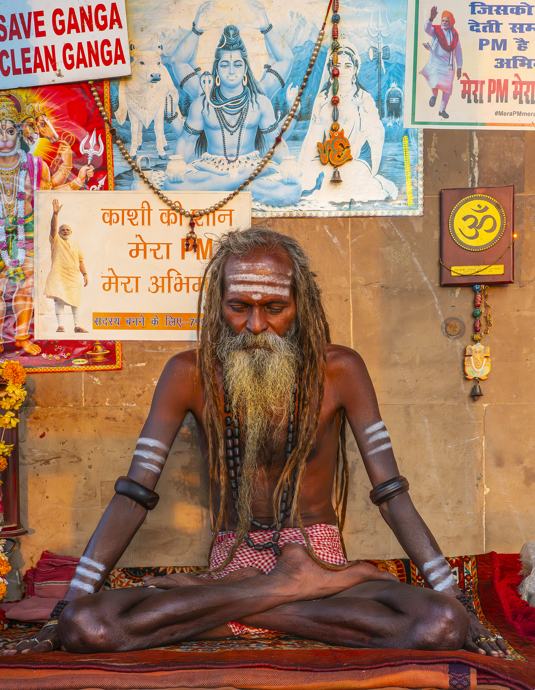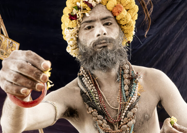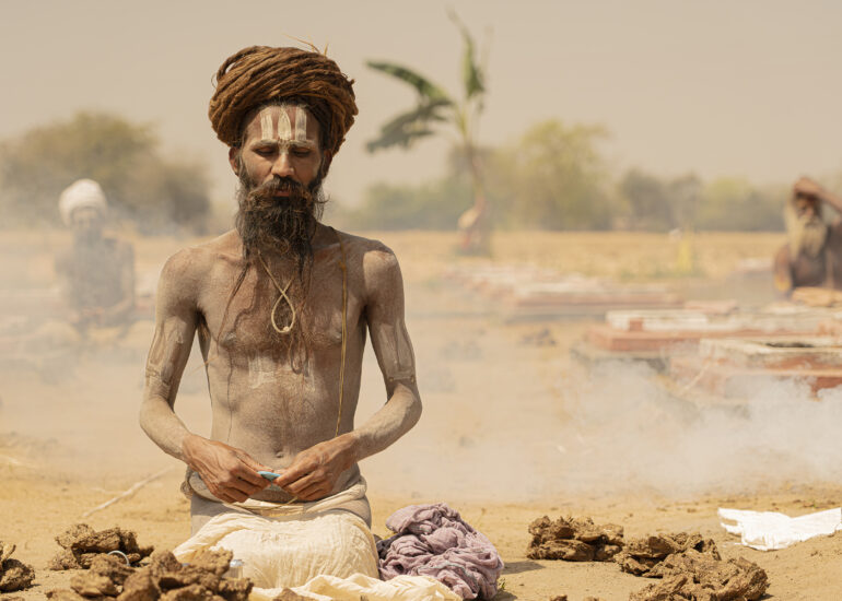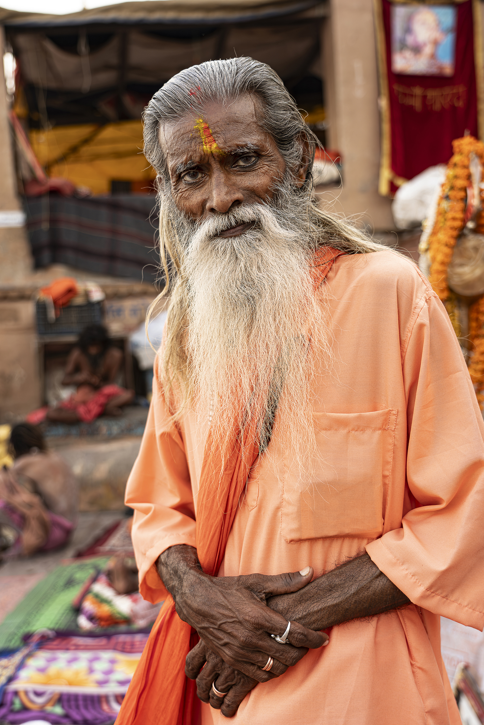 Facing the entrance, a man of indeterminate age, draped in an orange cloth, wears a thick beard. Yellowish-gray, frizzy like steel wool, it covers the entire lower part of his face and gives him an air that is both authoritative and inviting. Intrigued by our visit, he bows slightly and invites us to follow him. The man in the tunic exchanges a few words—probably customary greetings and instructions—with Sanjay, then leaves us free to wander.