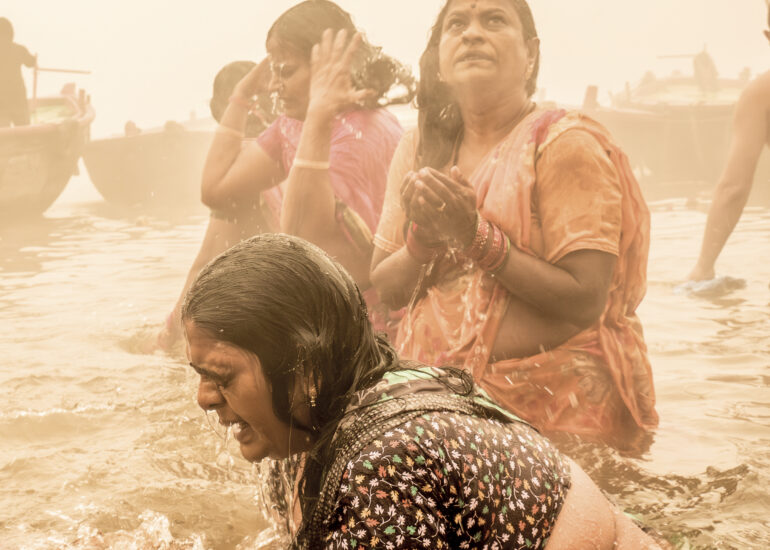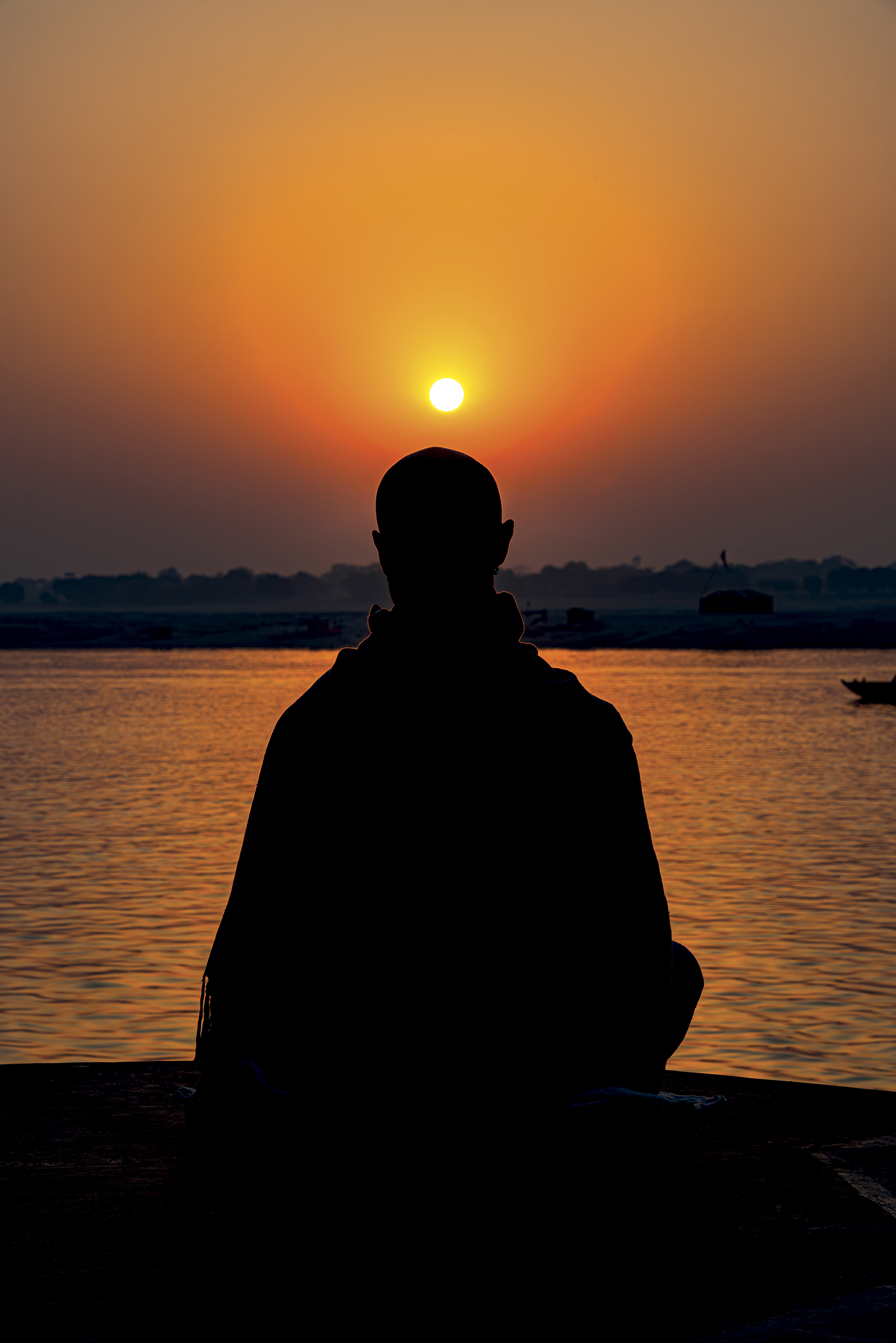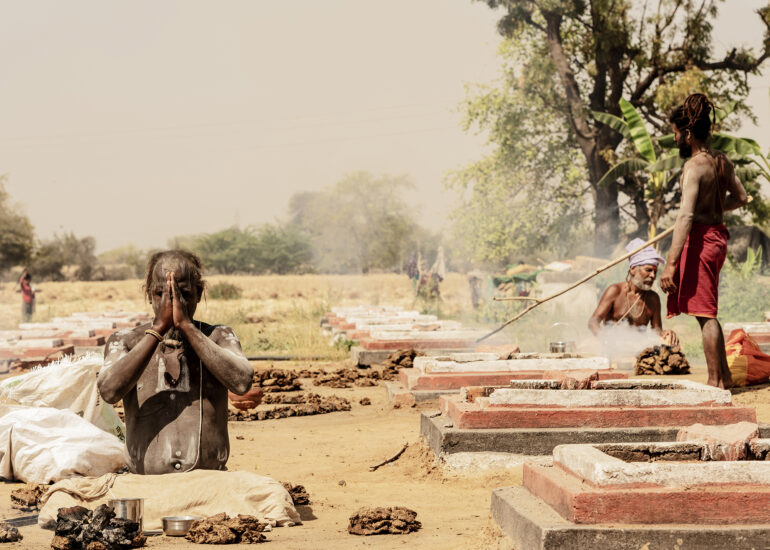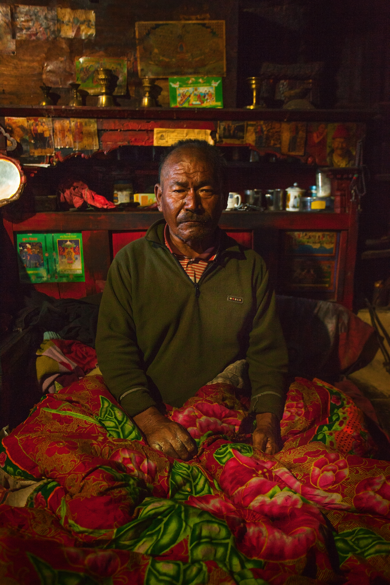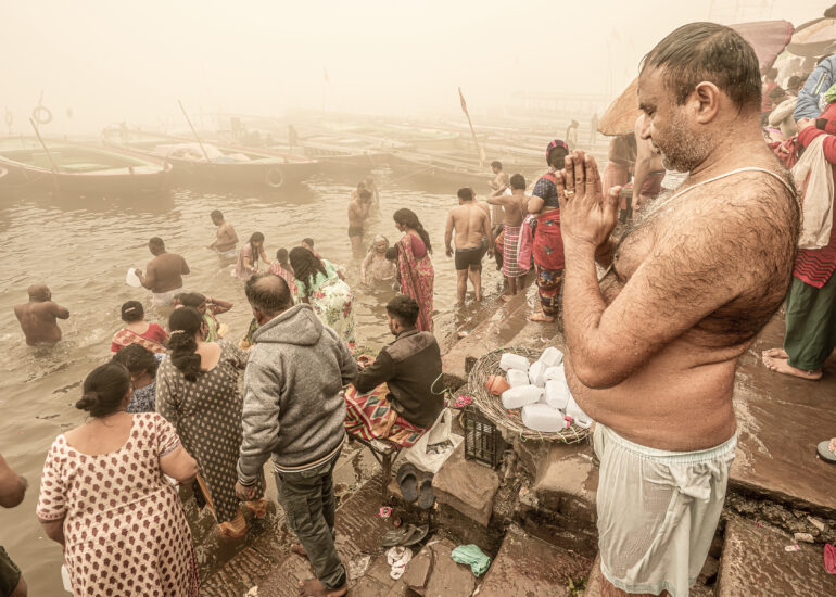 Facing the entrance, a man of indeterminate age, draped in an orange cloth, wears a thick beard. Yellowish-gray, frizzy like steel wool, it covers the entire lower part of his face and gives him an air that is both authoritative and inviting. Intrigued by our visit, he bows slightly and invites us to follow him. The man in the tunic exchanges a few words—probably customary greetings and instructions—with Sanjay, then leaves us free to wander.